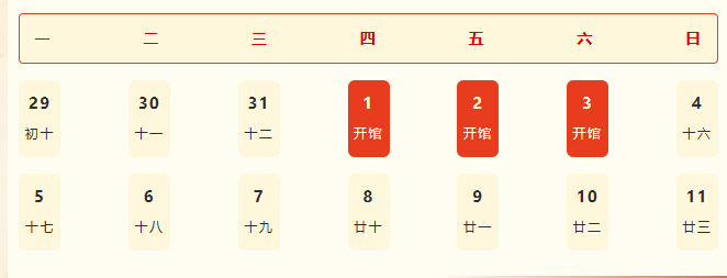 根据《国务院办公厅关于2026年部分节假日安排的通知》精神,结合我馆实际,2026年元旦假期开放安排如下:延时至17:30闭馆,16:30停止入馆