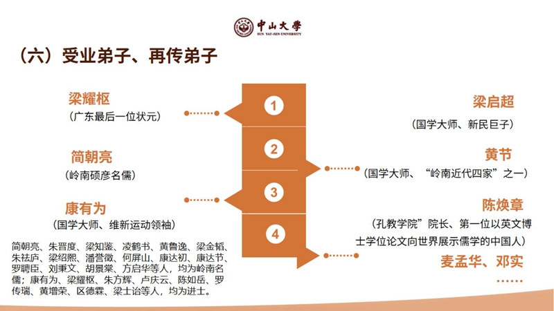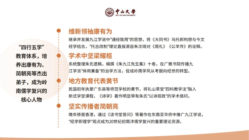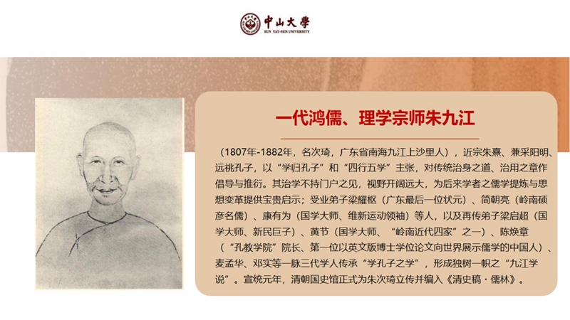 朱九江先生是清代南海九江人,著名的鸿儒宗师。他融通经史、躬行践履,主张“学归孔子”,提倡“四行五学”。他治学视野开阔,不持门户之见。在其门下,英才辈出,如广东最后一位状元顺德人梁耀枢、维新变法主要倡导者南海人康有为、清末民初岭南学者顺德人简朝亮等等。