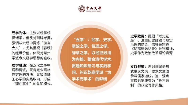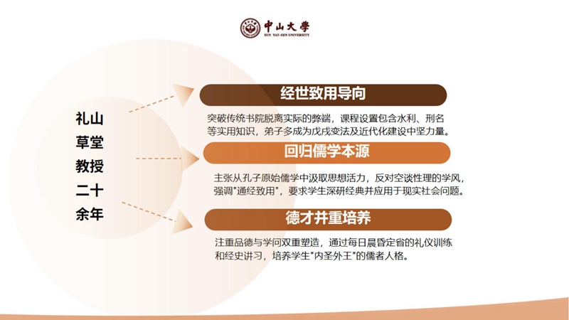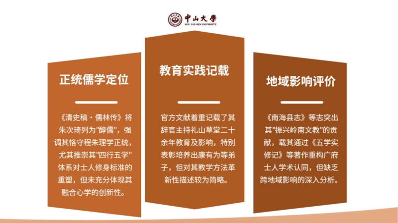 邓菀莛老师从历史评价与争议、学术思想及体系、学说传承与发展三个维度,立体勾勒了朱九江先生的生平与思想。邓老师首先客观梳理了历代学者对朱九江学说的不同评价与争议;进而深入浅出地剖析“四行五学”的精髓,阐述朱九江先生如何融汇朱子理学与阳明心学,最终归宗孔子,构建起一套注重实践的学术体系;最后清晰地展现了从梁耀枢、简朝亮、康有为到梁启超、陈焕章、黄节、邓实等一脉相承的弟子谱系,生动说明了“九江学说”如何经由这些门人发扬光大,深远影响了中国近代思想的发展历程。