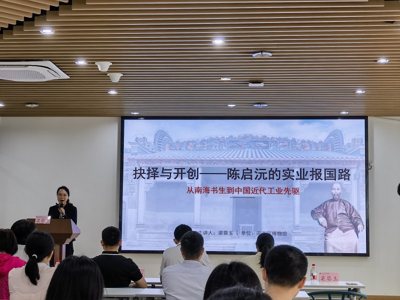 4月22日,第八届“书香广职”读者活动月暨“六藝讲坛”第九讲在广东职业技术学院(以下简称“广职院”)举行。南海区博物馆梁葵玉以《抉择与开创——陈启沅的实业报国路》为题,用生动的叙事和大量的史料,与师生们一起重温了近代民族工业先驱陈启沅的爱国事迹。
