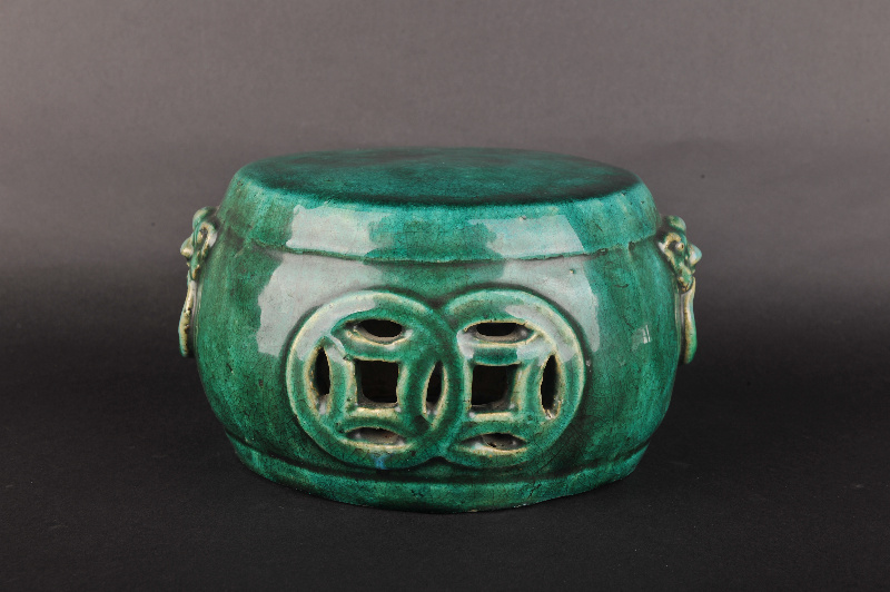 清绿釉双铺首耳双钱纹墩形陶器座