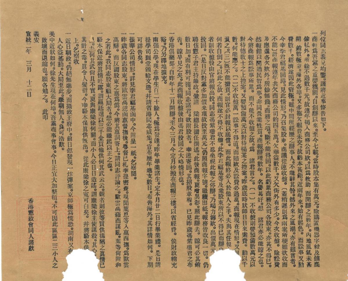 《商报》作为香港保皇会机关报,因其纸本难觅,其发行与内容难以考证。本文以馆藏伍宪子旧藏布告为基础,对《商报》作初步拓展论述。1904年春,康有为、梁启超和徐勤等保皇会首领在香港举行保皇会代表大会,其中议题之一便有开设《商报》[1]。“诚以香港切近内地、见闻较切,且又为中外交通之枢纽,同志之往来、消息之通传,皆以香港为首要”[2]。港澳作为连接中国与海外华人的门户,其对于保皇会而言至关重要。根据澳洲保皇会机关报《东华新报》可知[3],《商报》作为香港保皇会喉舌,积极履行其宣传职能,继续传播康有为及其追随者的政治主张,同时通过新闻报道向公众展示保皇会于海外及香港的活动,包括募集捐款、召开公众集会、进行政治演说等。此外,该报还承担保皇会内部通讯与信息传递职能。
