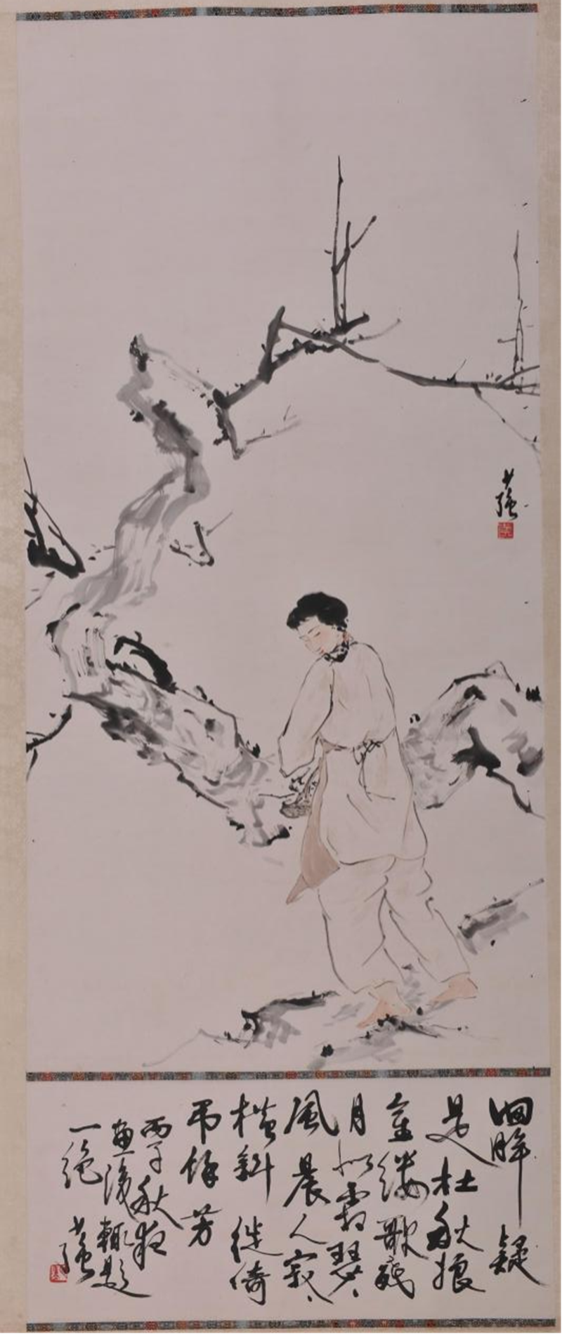 作品赏析:此《金缕歌残轴》描绘了盘虬曲折的古树下,秋风萧瑟的夜月里,一流浪歌女倚树神情悲怆地回眸,歌女赤脚站立,腰系围裙,身着朴素的场景。局部略施墨彩,以线条勾勒人物造型。为使画作主题更加鲜明突出,黄少强另在诗堂题写诗句,用历史人物杜秋娘比拟,突出歌女之悲情,杜秋娘吟唱金缕歌,亦是歌女之写照。黄少强题写的诗句题跋,使得书法、诗情、画意相互配合,相得益彰。其题诗浅显易懂却寓意深刻,书法行文流畅洒脱,画作线条简单灵动。黄氏的水墨人物画吸取西画的造型基础,以传统的艺术样式(诗、书、画交相辉映)反映社会现实生活,具有极强的平民意识,无疑为黄少强人物画的一大特色。