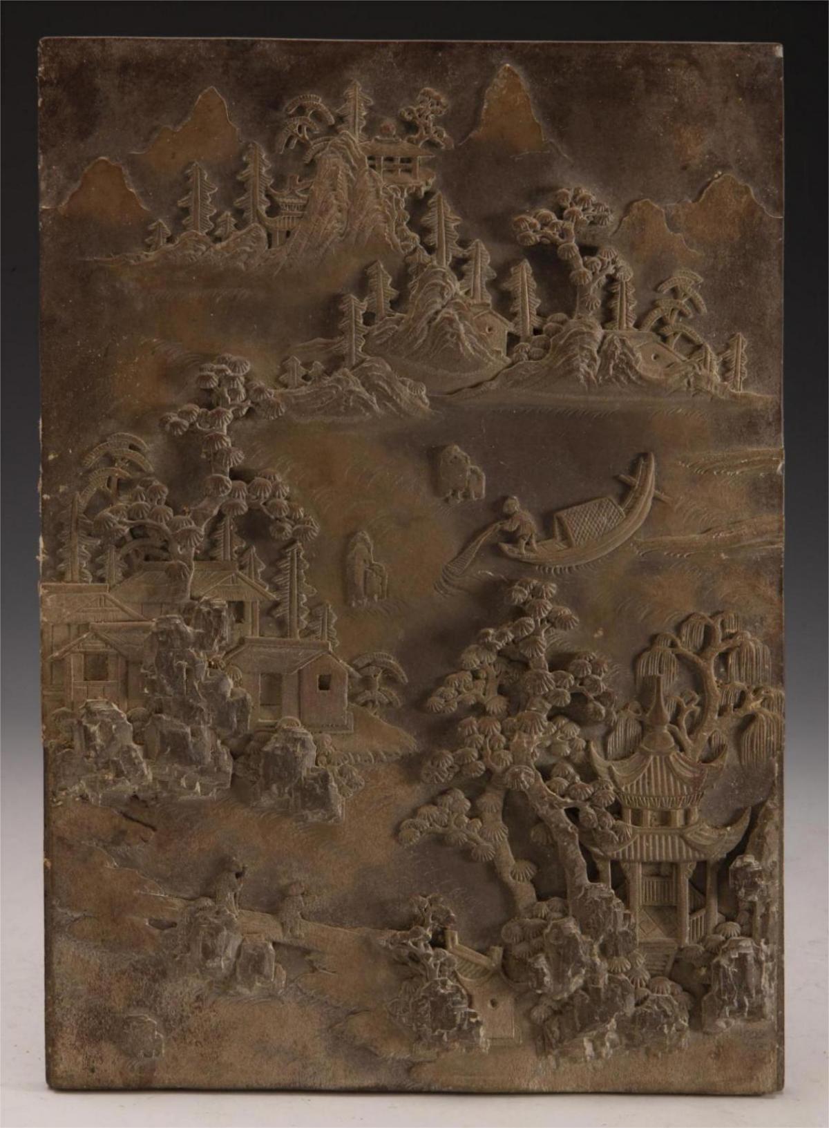 清石雕山水人物图屏心,质地:石,尺寸:纵29.5厘米,横20.8厘米。