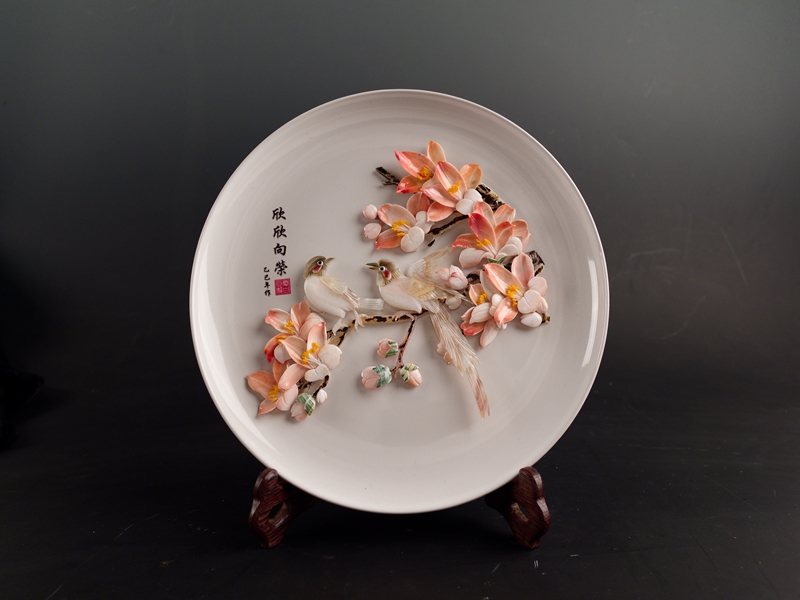 1.欣欣向荣木棉双喜图托盘贝雕摆件