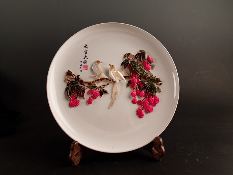 5.大吉大利红荔双寿图托盘贝雕摆件